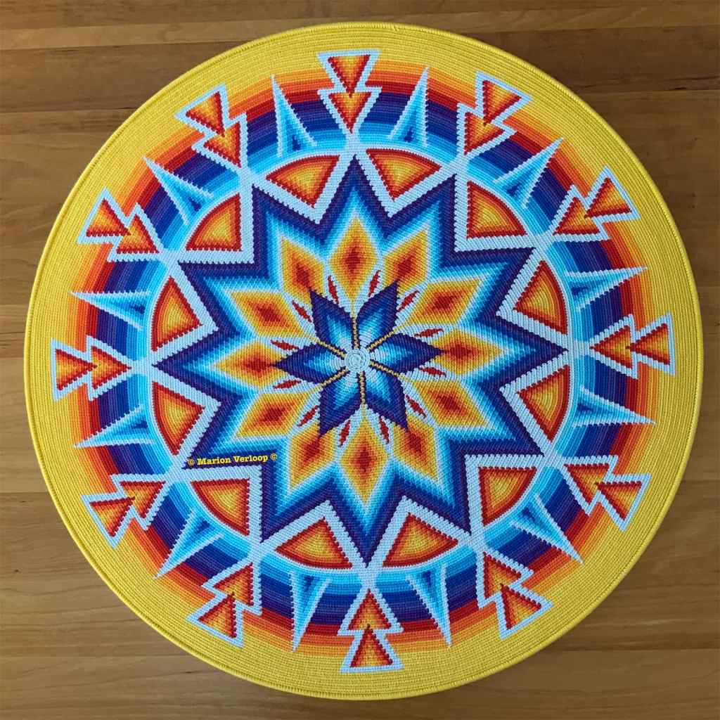 This pattern is best suited for experienced Mochila makers. The finished mandala is about 60 cm (23.5 inches) in diameter, with an option for a smaller version (40 cm / 15.7 inches).